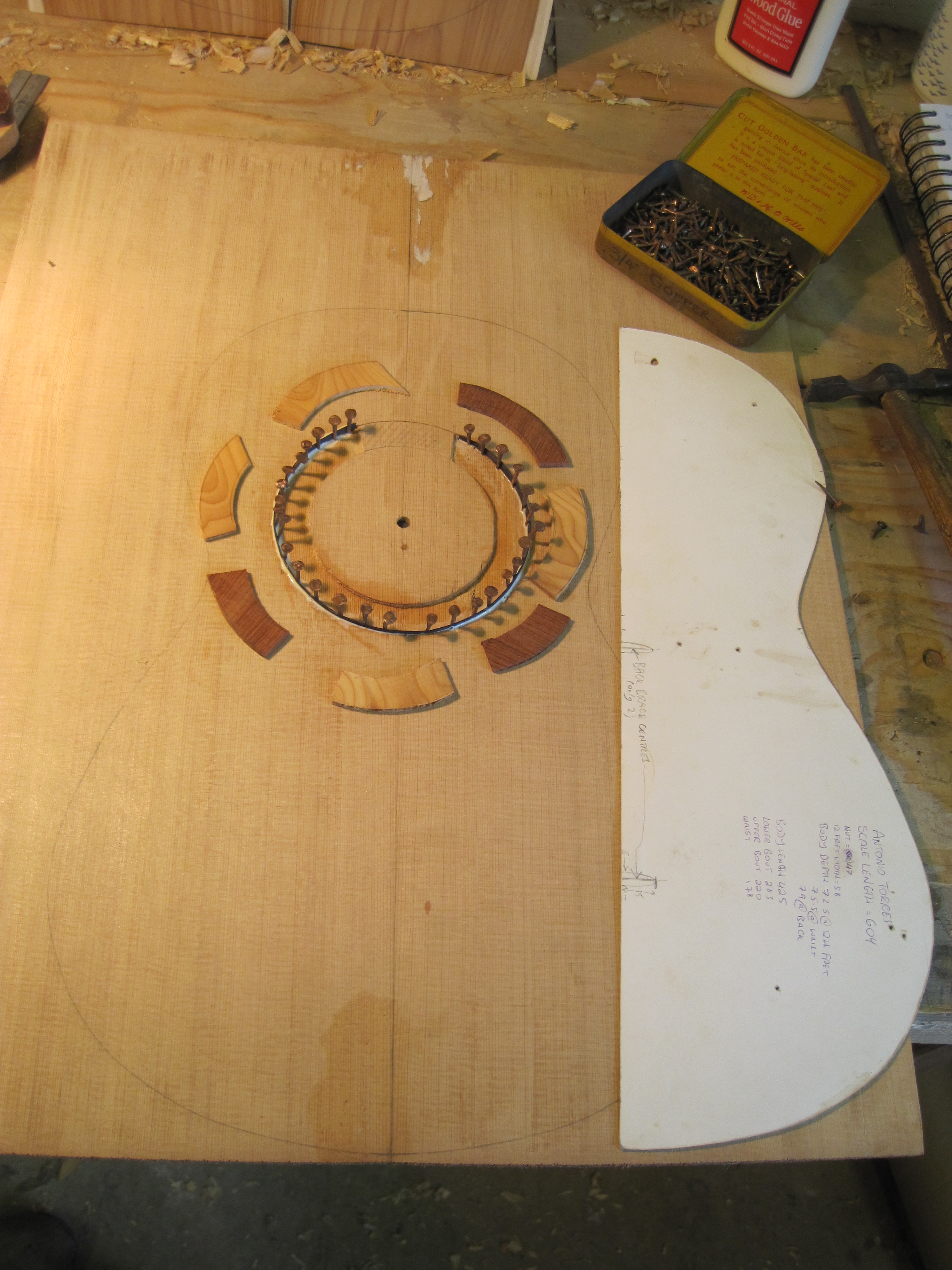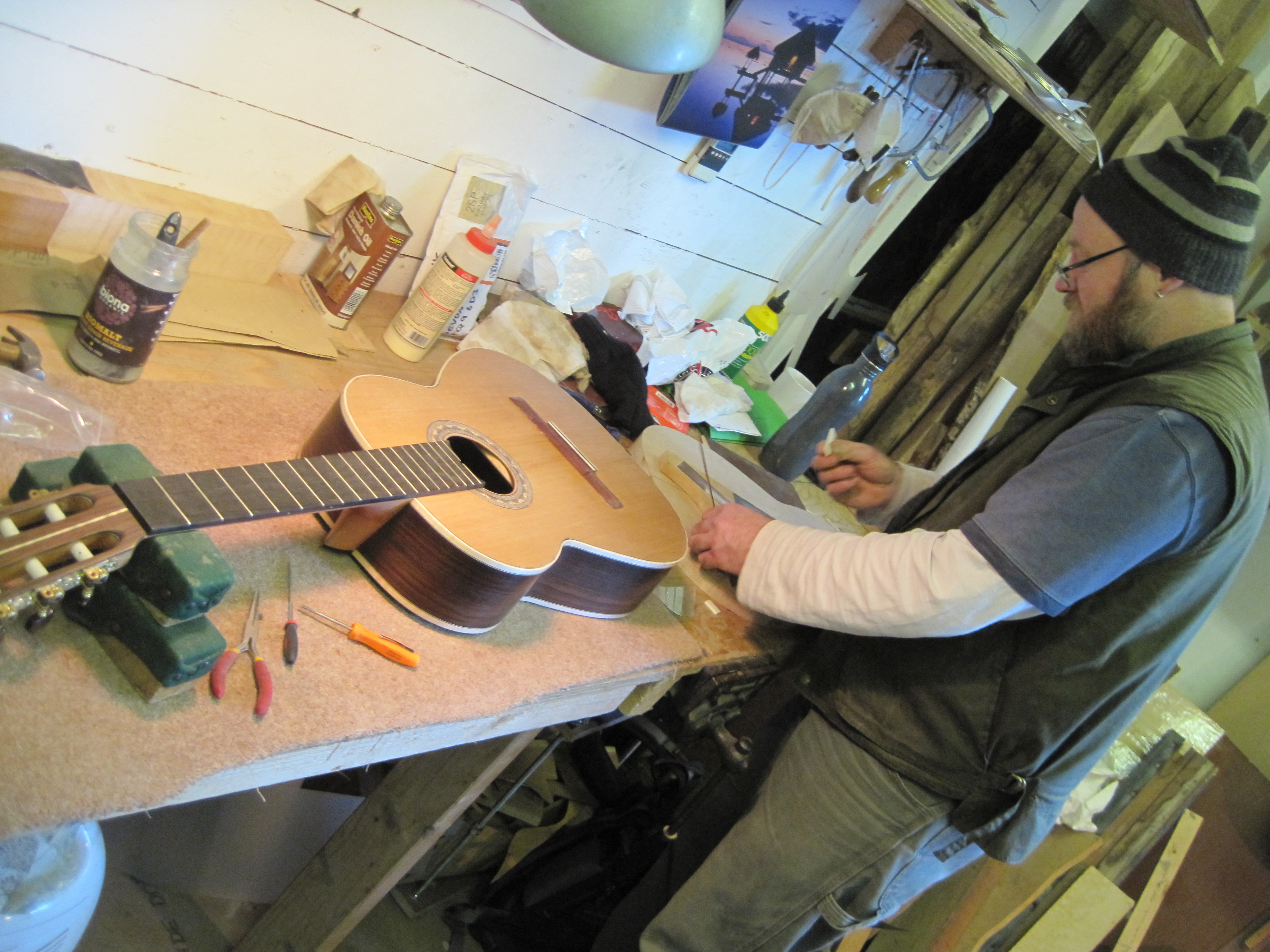 Sterling from Colorado, U.S.A. has recently completed a Concert Torres Guitar on a one month intensive course with me. During this time we worked together on his instrument. I like to encourage my student’s creativity so he was able to make his own rosette. decoration and headstock to his own chosen design. To keep us to our deadline of one month we used some components I had already made such as the back, sides and neck. The project had a very organic feel as we worked together for most of it, using the materials which happened to be in the workshop at the time (back and sides are Mexican Cypress I’ve had since my time there 10 years ago.) By the end Sterling had made a very fine sounding Concert Classical Guitar to the design of our master Antonio Torres. The sound was astonishing…clear,powerful, sweet trebles, very responsive and able to be played very loud as well as softly. Well done Sterling!