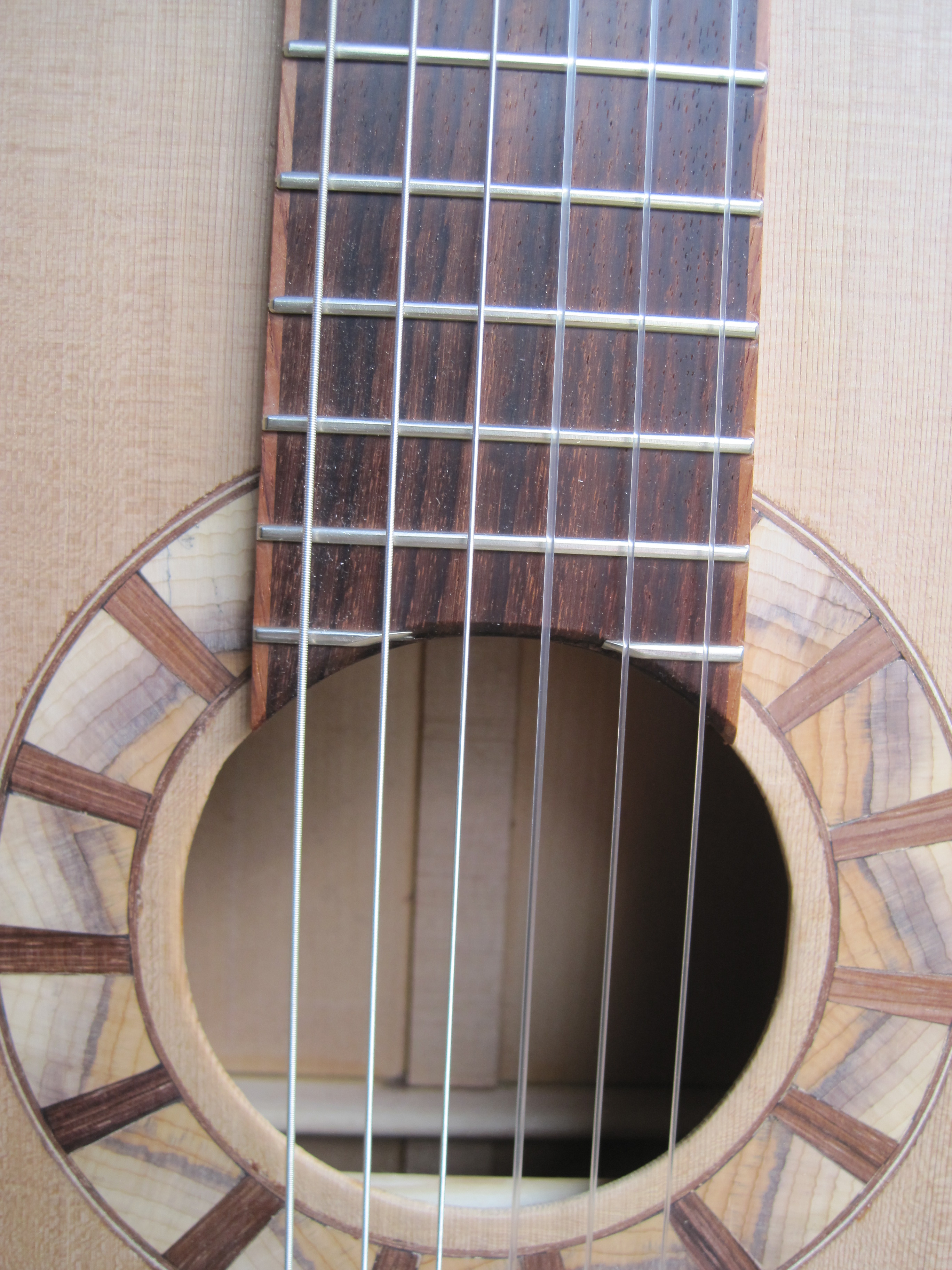 Sterling from Colorado, U.S.A. has recently completed a Concert Torres Guitar on a one month intensive course with me. During this time we worked together on his instrument. I like to encourage my student’s creativity so he was able to make his own rosette. decoration and headstock to his own chosen design. To keep us to our deadline of one month we used some components I had already made such as the back, sides and neck. The project had a very organic feel as we worked together for most of it, using the materials which happened to be in the workshop at the time (back and sides are Mexican Cypress I’ve had since my time there 10 years ago.) By the end Stirling had made a very fine sounding Concert Classical Guitar to the design of the master Antonio Torres. The sound is astonishing…clear,powerful, sweet trebles, very responsive and able to be played loud aswell as softly. Well done Sterling!